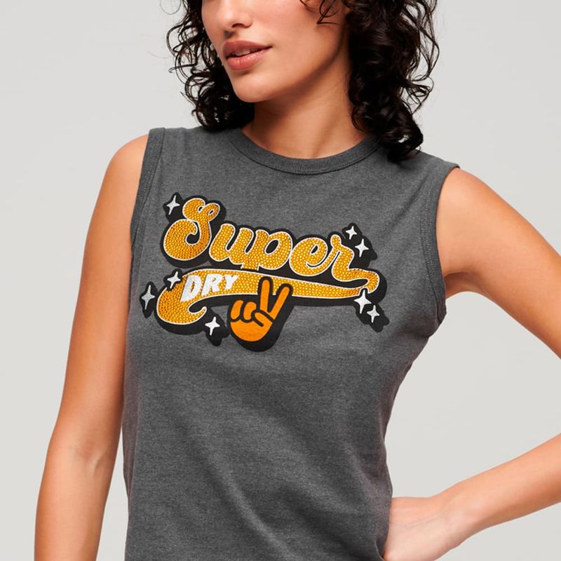 Esta camiseta es una forma sencilla de crear un look llamativo. Sus adornos aportan un toque refinado a los gráficos estampados para darte un look distintivo que saque tu lado más auténtico. Corte entallado: un diseño que se ajusta más al cuerpo para un look más elegante, Escote redondo pronunciado, Diseño sin mangas, Gráfico estampado con adornos, Etiqueta de Superdry.