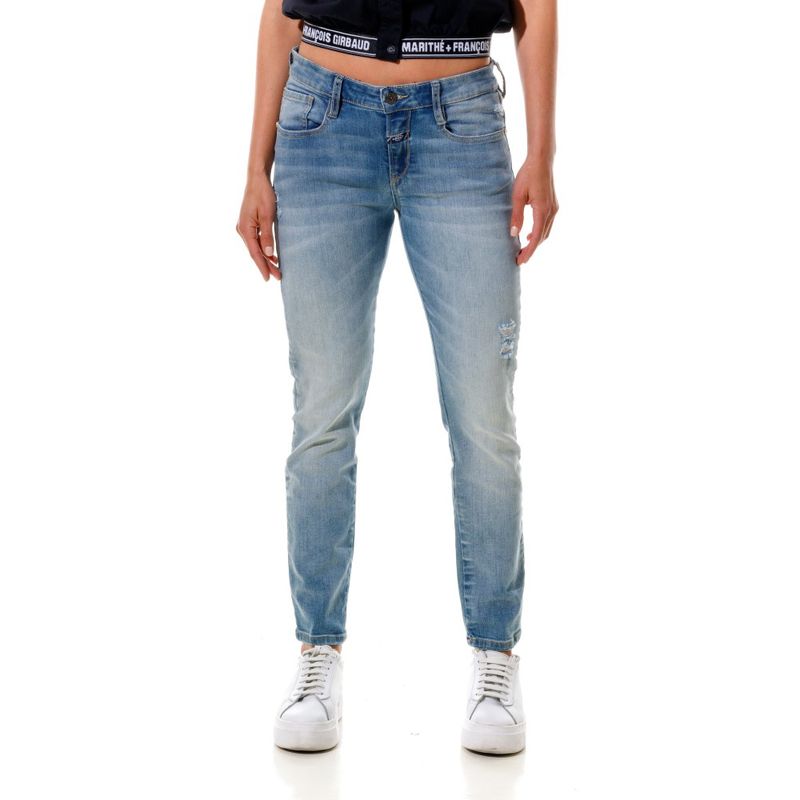 Marithé François Girbaud es una marca innovadora y vanguardista en conceptos de moda.Descubre tu outfit y no te quedes sin lo mejor de la moda internacional.Jean tiro bajo con 5 bolsillos . Efecto lavado azul claro. Fit skinny. Cierre frontal con cremallera y botón metálico. La modelo mide entre 1.70 y 1.75, la prenda superior es talla m y la prenda inferior es talla 8. Composición:98%Algodón,2%Elastano País origen: Colombia