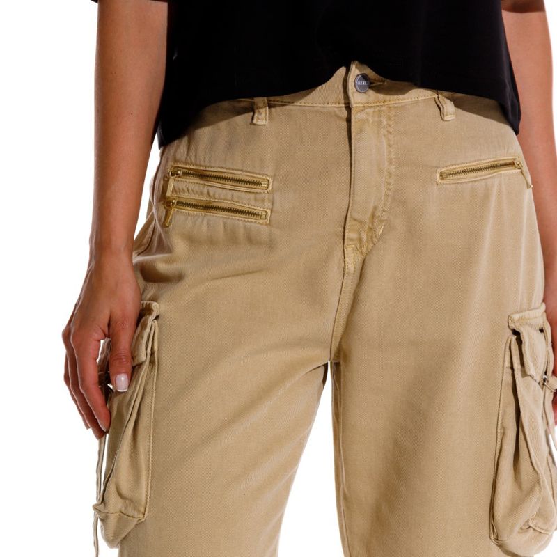 Pantalón tiro medio tipo cargo. Efecto lavado café claro. Fit regular. Cierre frontal con cremallera y botón metálico.